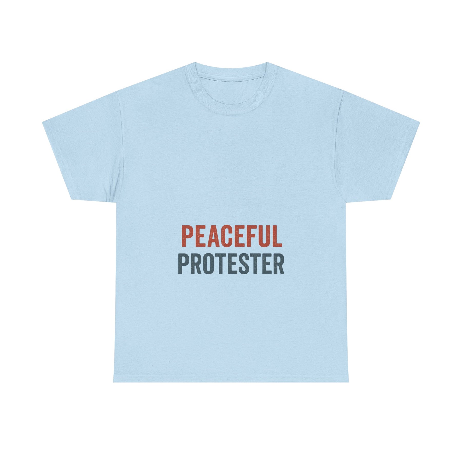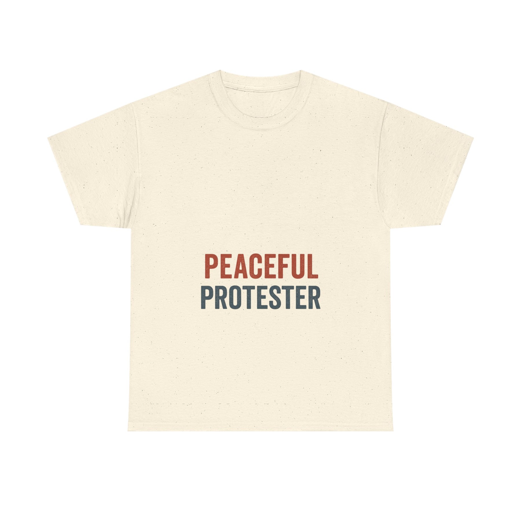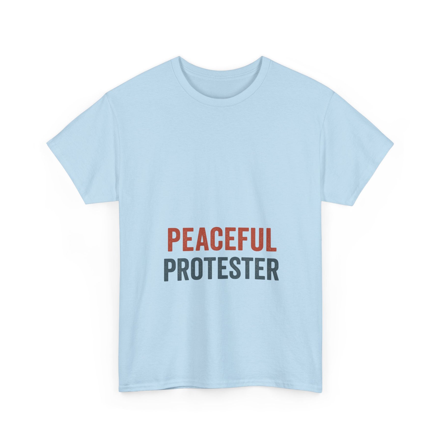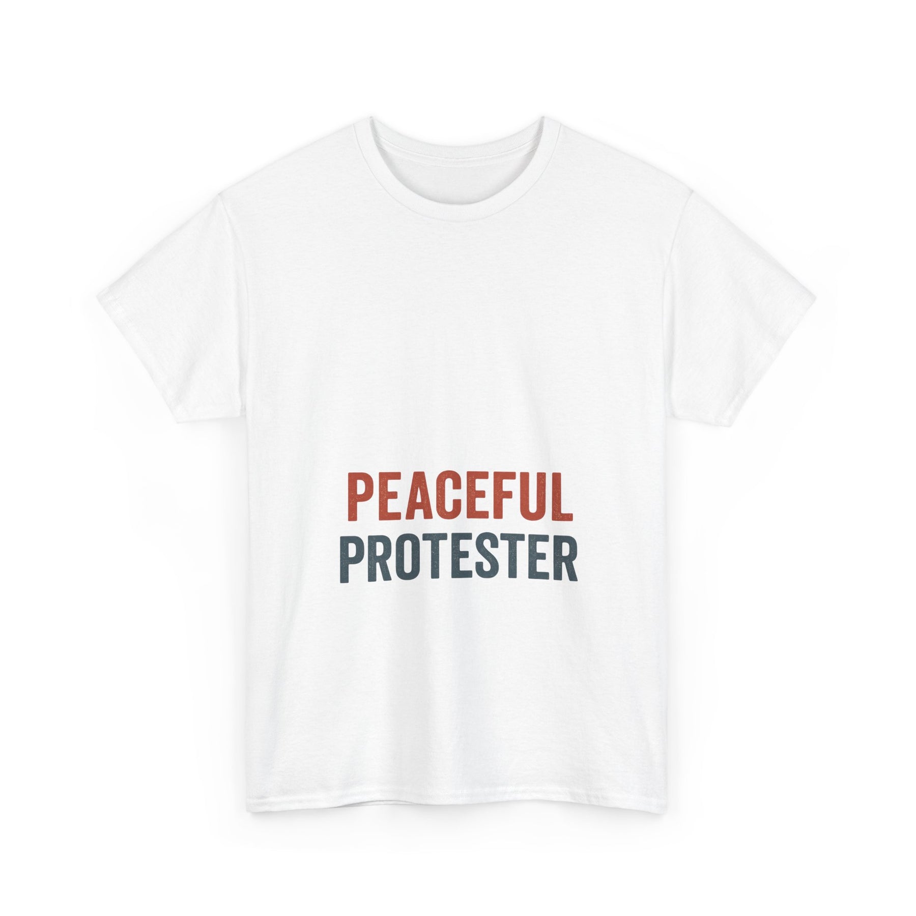 A soft, breathable tee that speaks with quiet confidence. 'Peaceful Protester' is set in clean, two-tone type on a classic white crew shirt — calm in color, loud in intention. This shirt sits comfortably through rallies, long conversations, and everyday life. It moves with you: the medium-weight cotton holds shape while the ribbed collar and shoulder tape keep the silhouette neat after many wears. Wear it to marches, community meetups, or street-side vigils to show steady solidarity without shouting. The understated design fits easily into layered looks — hoodies, jackets, or over a long-sleeve — and keeps the message centered and clear.