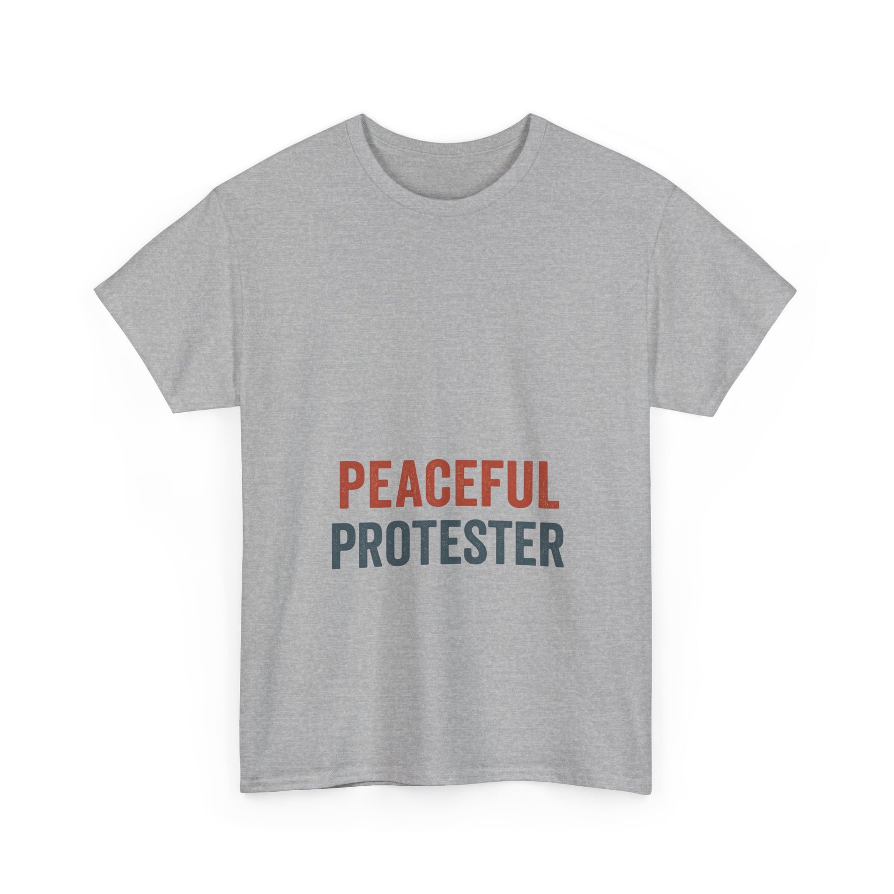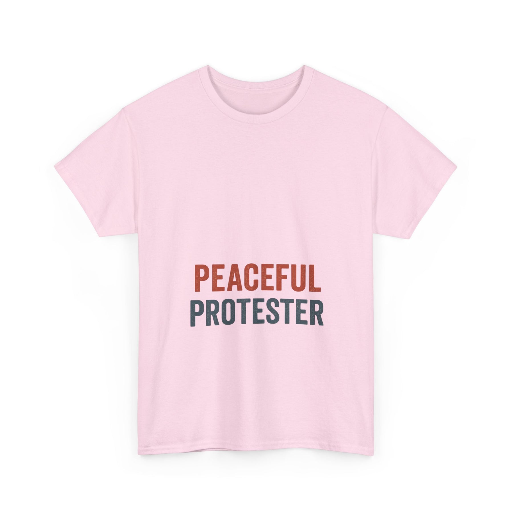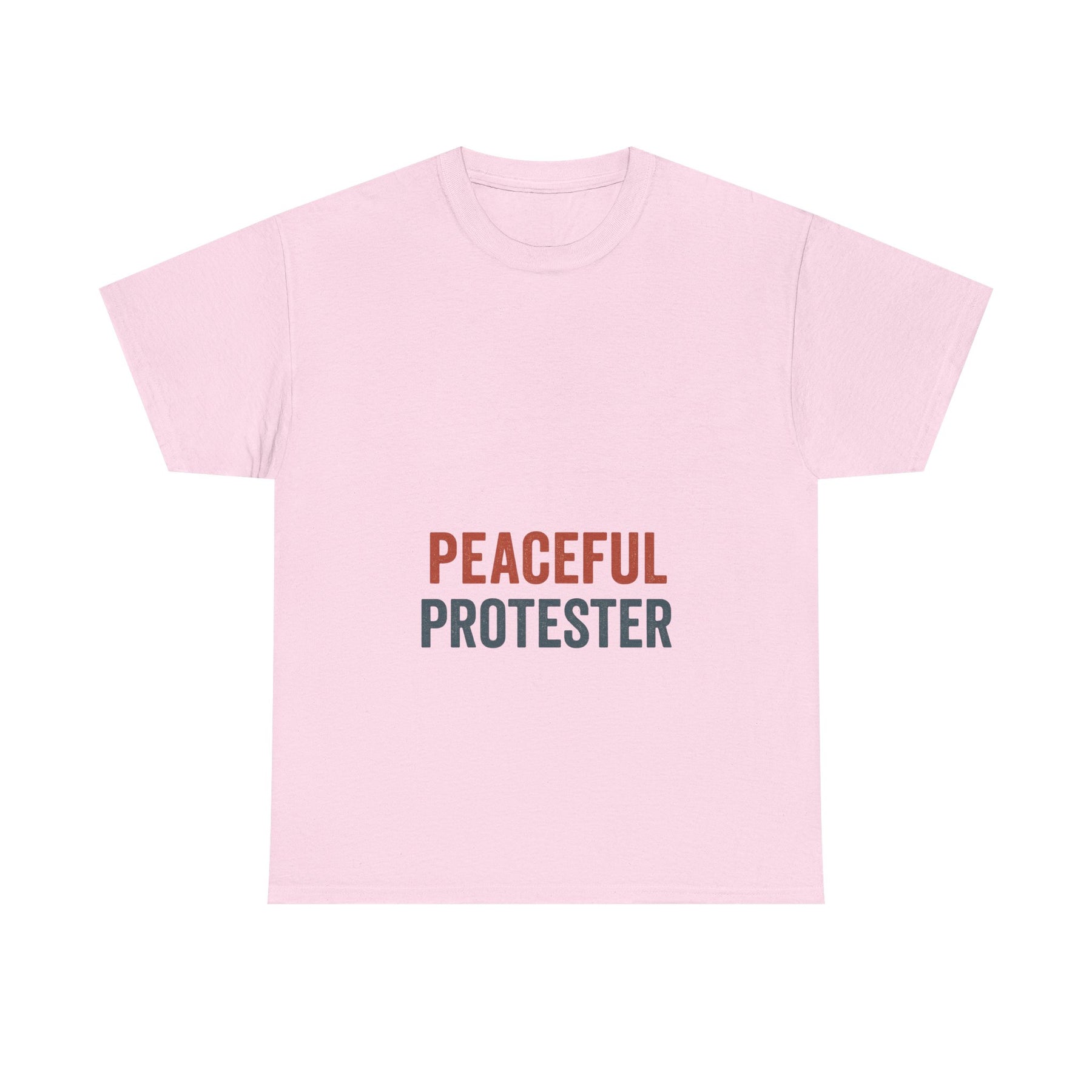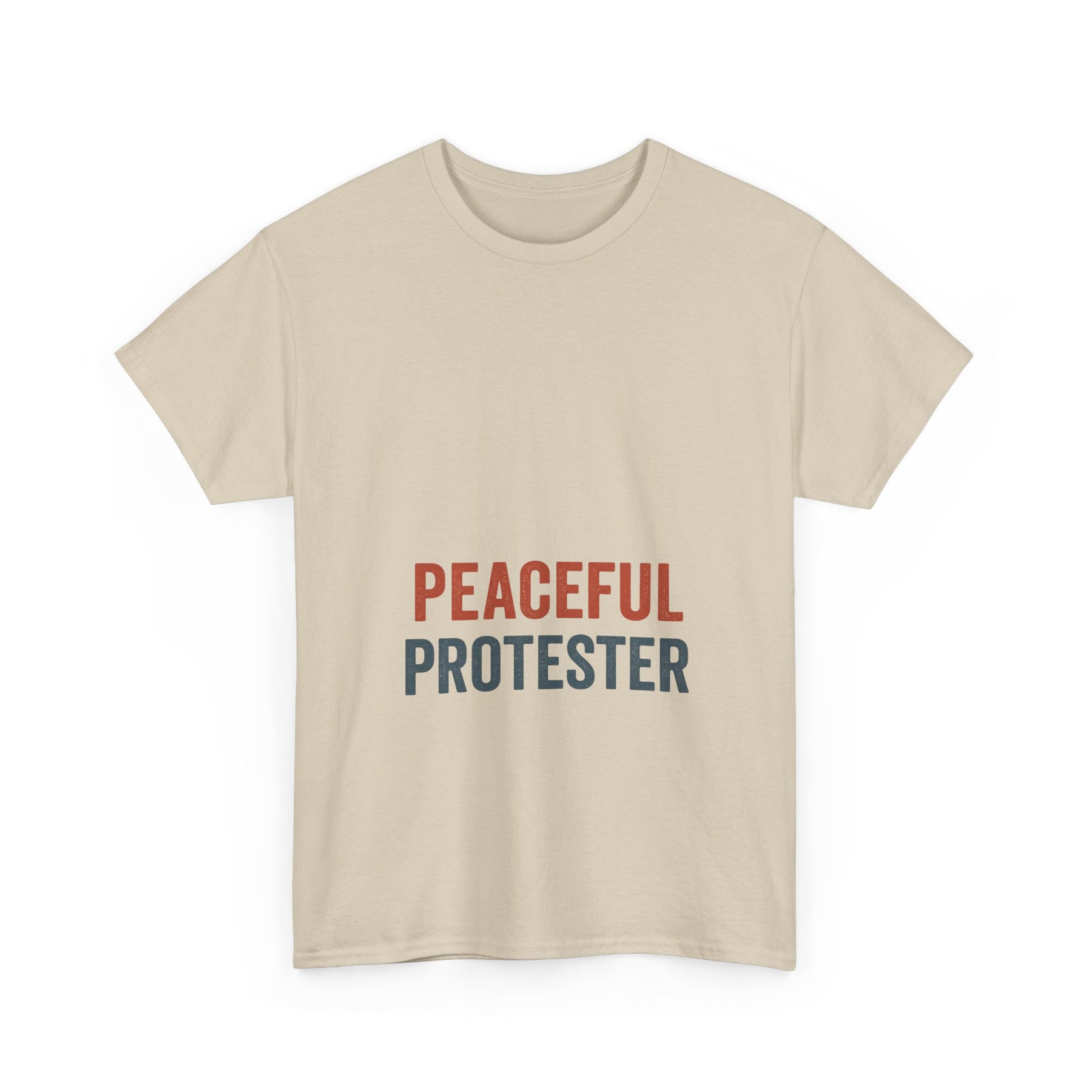 A soft, breathable tee that speaks with quiet confidence. 'Peaceful Protester' is set in clean, two-tone type on a classic white crew shirt — calm in color, loud in intention. This shirt sits comfortably through rallies, long conversations, and everyday life. It moves with you: the medium-weight cotton holds shape while the ribbed collar and shoulder tape keep the silhouette neat after many wears. Wear it to marches, community meetups, or street-side vigils to show steady solidarity without shouting. The understated design fits easily into layered looks — hoodies, jackets, or over a long-sleeve — and keeps the message centered and clear.