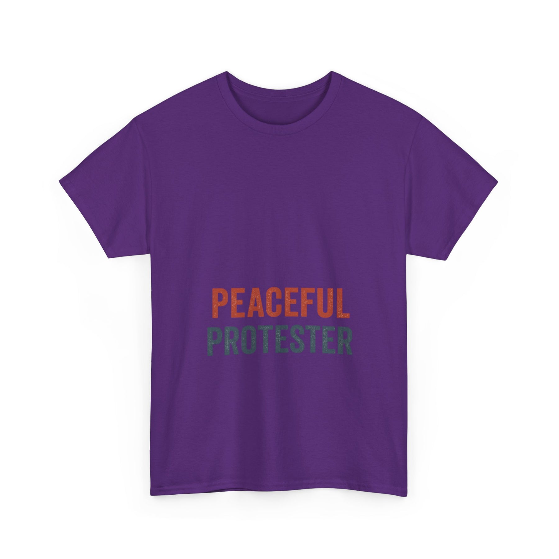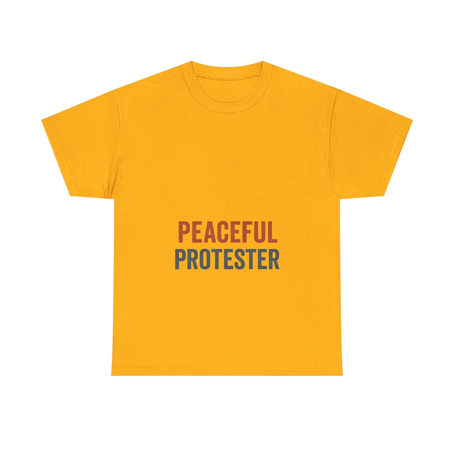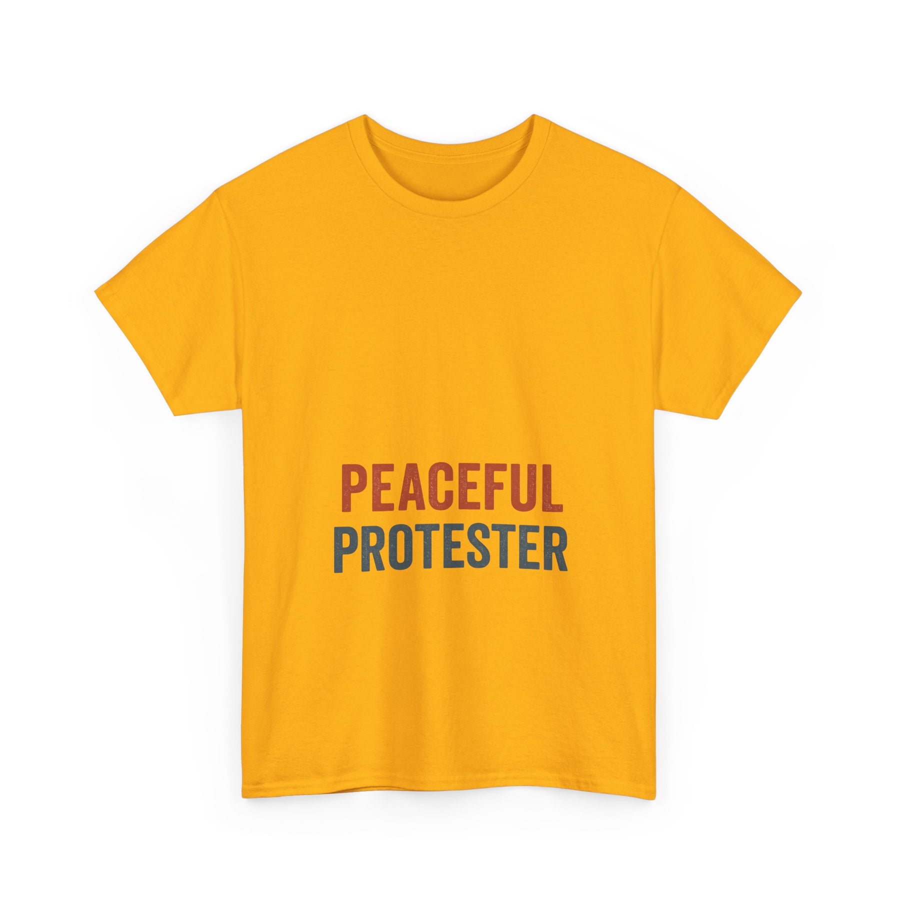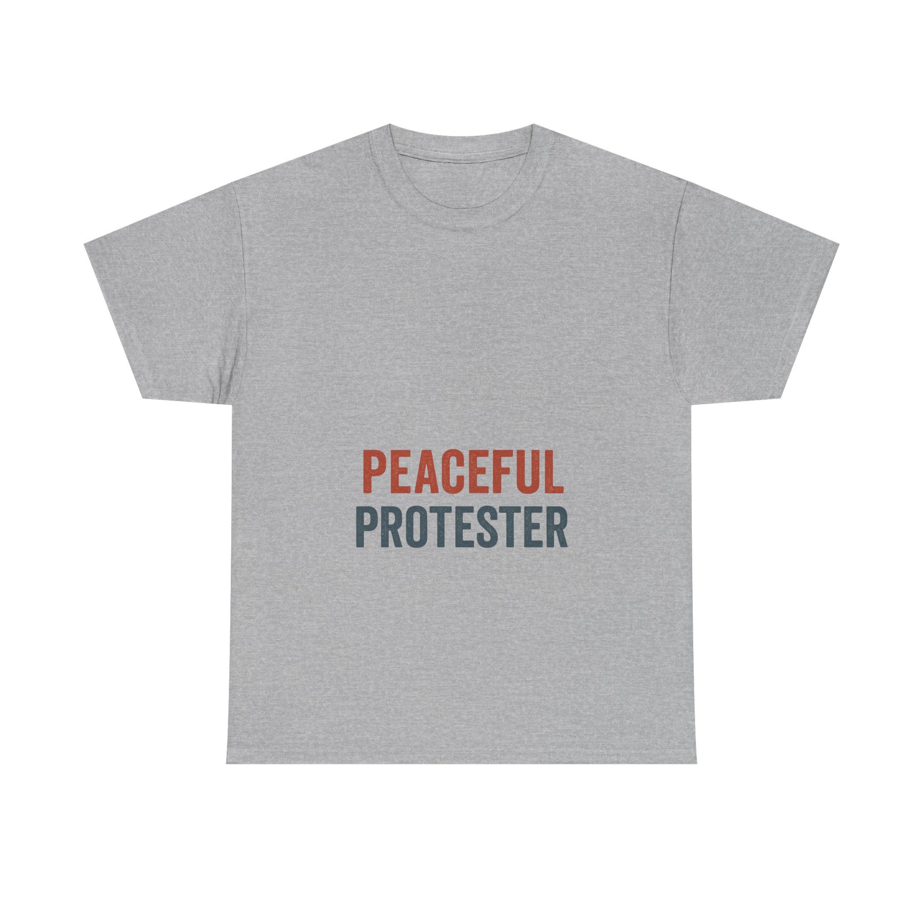 A soft, breathable tee that speaks with quiet confidence. 'Peaceful Protester' is set in clean, two-tone type on a classic white crew shirt — calm in color, loud in intention. This shirt sits comfortably through rallies, long conversations, and everyday life. It moves with you: the medium-weight cotton holds shape while the ribbed collar and shoulder tape keep the silhouette neat after many wears. Wear it to marches, community meetups, or street-side vigils to show steady solidarity without shouting. The understated design fits easily into layered looks — hoodies, jackets, or over a long-sleeve — and keeps the message centered and clear.