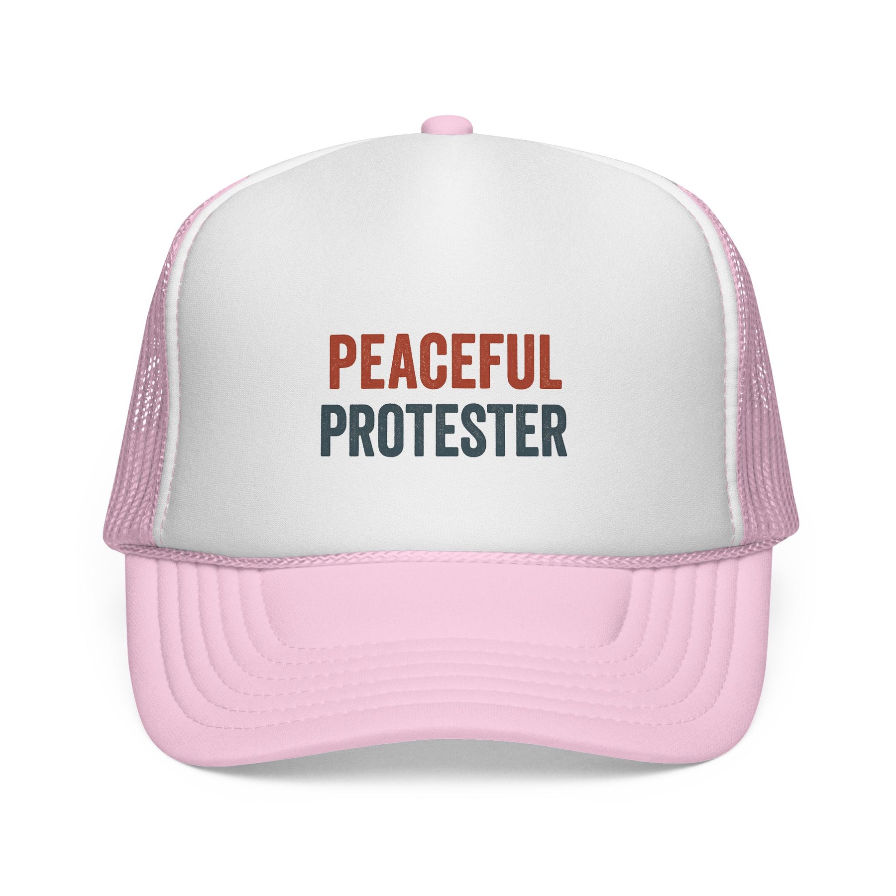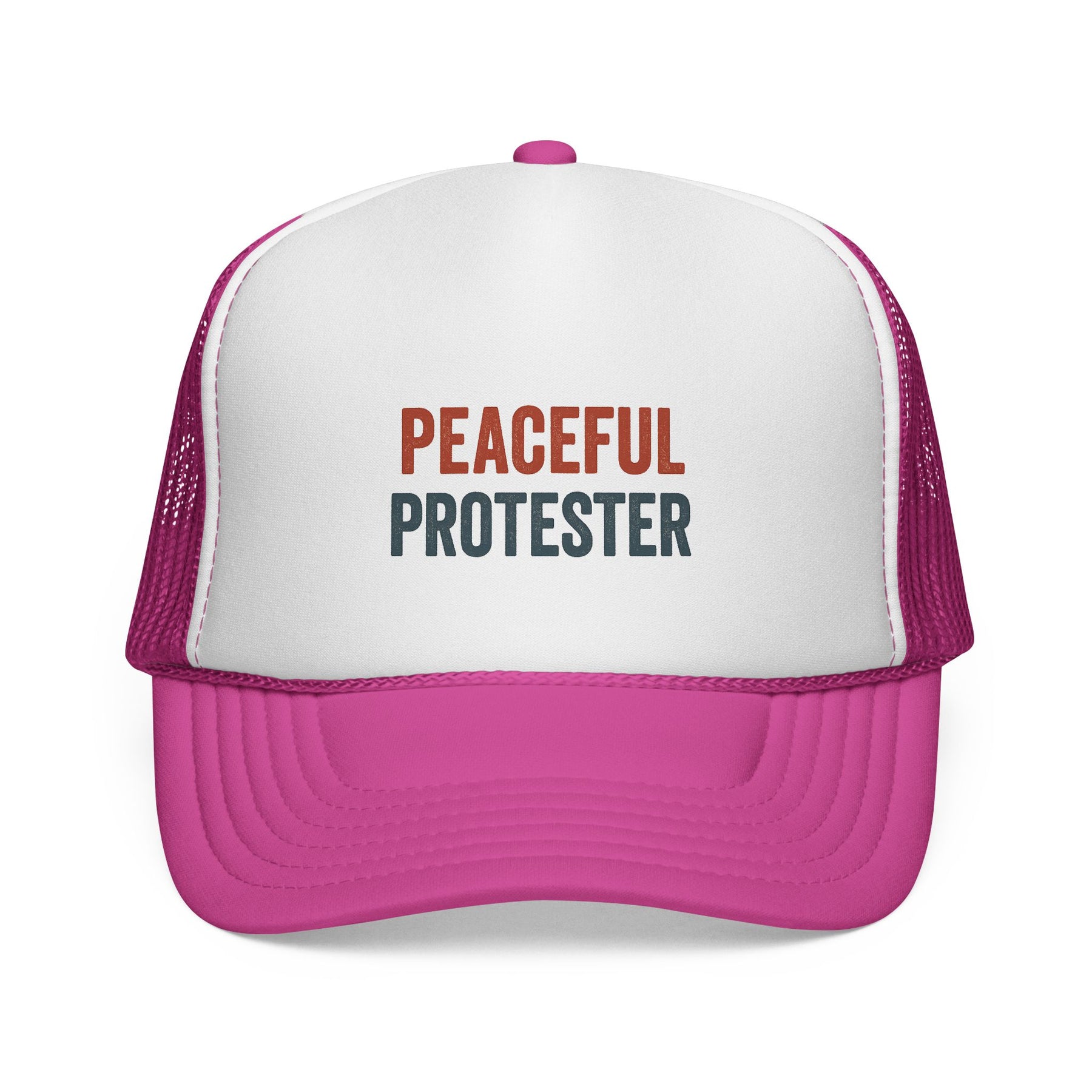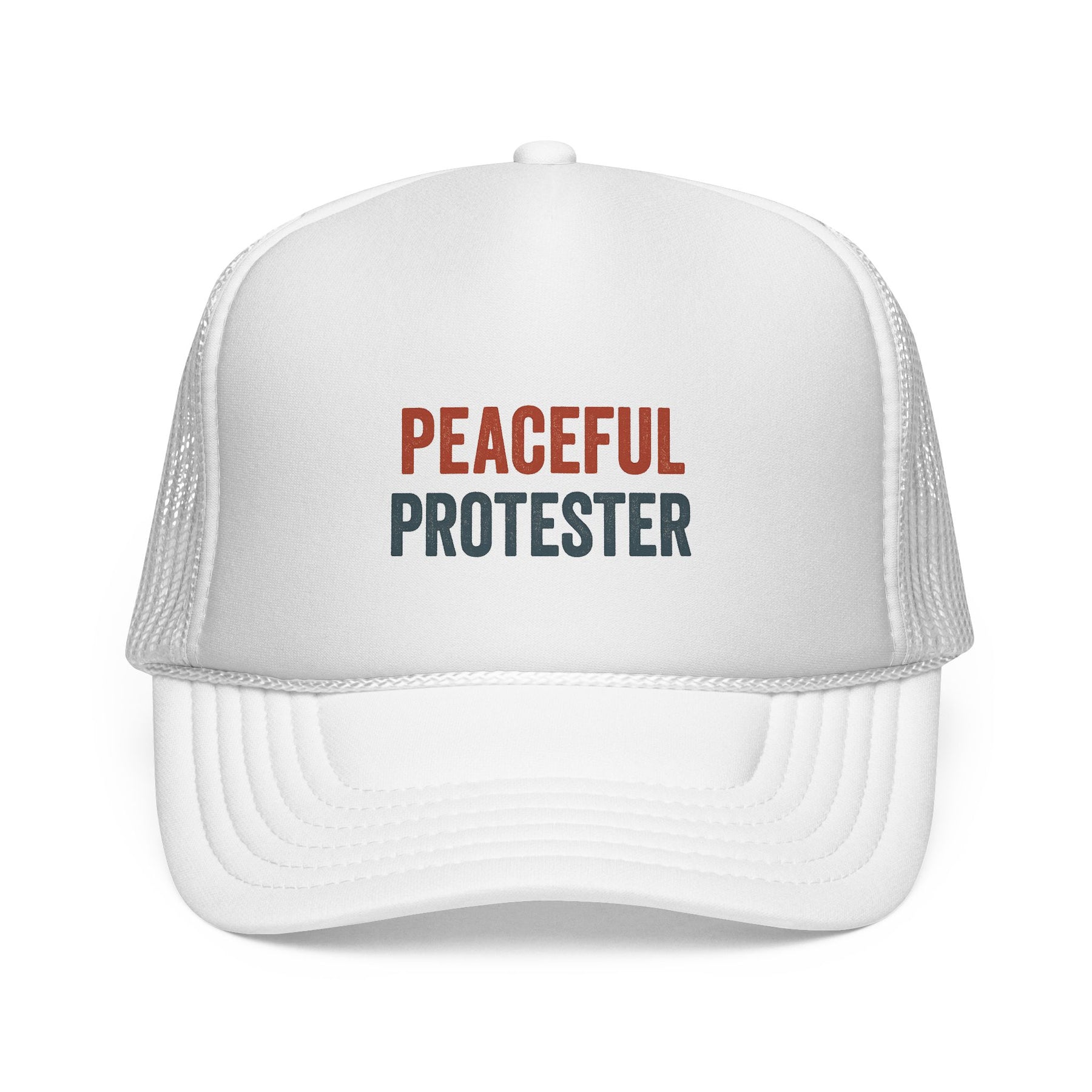 This bold trucker cap carries a calm-but-clear message. The foam front showcases a distressed, two-line "PEACEFUL PROTESTER" graphic that reads like a quiet declaration — worn on marches, commuting, or standing on street corners. Lightweight nylon mesh keeps air flowing when the day heats up. The curved visor and six-row stitching hold shape through repeated wear. Adjustable sizing makes it easy to share with friends or family who show up to speak up. It’s the kind of hat that settles over your forehead and feels like a small, steady statement.